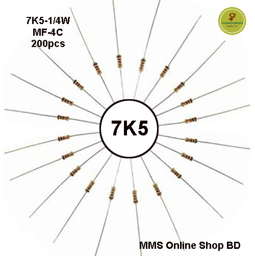 200Pcs 7K5 Metal Film Resistor 1/4W-0.25 Watt 5% Tolerance Fixed Resistors
